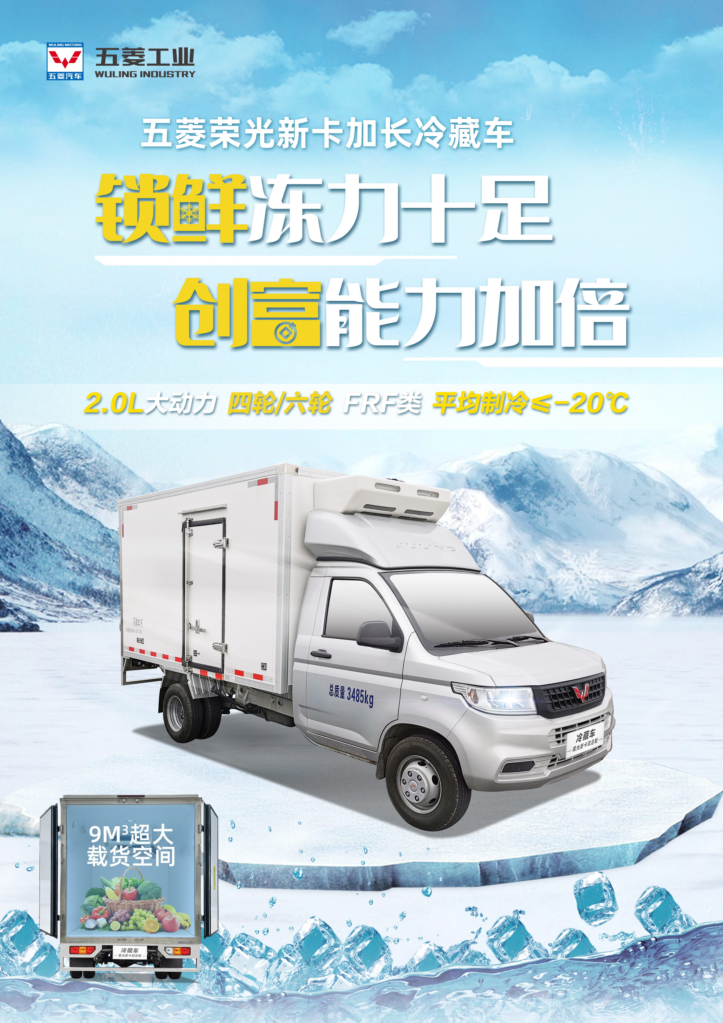 五菱榮光新卡加長冷藏車,2.0L排量汽油發(fā)動機(jī),加強(qiáng)型大梁;FRF類冷藏車、平均制冷溫度≤-20℃。四輪貨廂7.5m3? / 六輪貨廂9m3,雙后輪加強(qiáng)承載,重貨爬坡更從容。廣泛適用于冷凍食品/奶制品/蔬菜水果/肉類等對溫度敏感的貨品運送及保存!